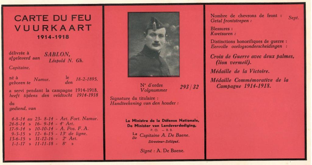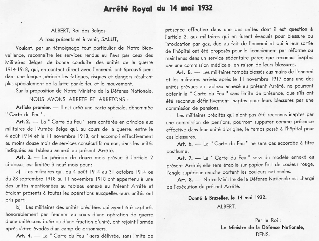 La Carte du Feu fut créée par l’Arrêté Royal du 14 mai 1932 pour être attribuée à tous les Belges qui ont accompli au moins 9 ou 12 mois, selon certaines conditions, dans une unité au contact de l’ennemi (voir plus bas le détail dans la transcription de l’Arrêté Royal).