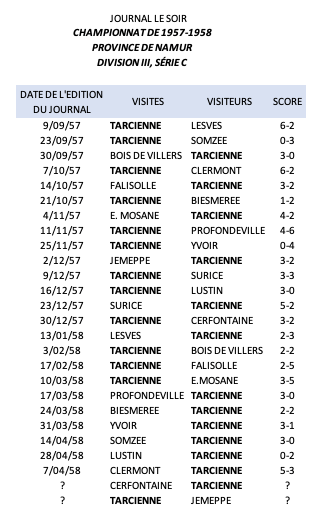 J’ai recherché et compilé les résultats hebdomadaires de l’équipe pour tenter de retracer ses performances lors de cette première saison 1957-58. Malheureusement, je n’ai pas trouvé les scores de tous les matchs: deux sont manquants. La presse était (est ?) fort discrète et parfois parcellaire en ce qui concerne les équipes des divisions dites inférieures. Je n’ai d’ailleurs trouvé aucun article, aussi petit fut-il, qui commentait, cette saison-là, un match de Tarcienne.