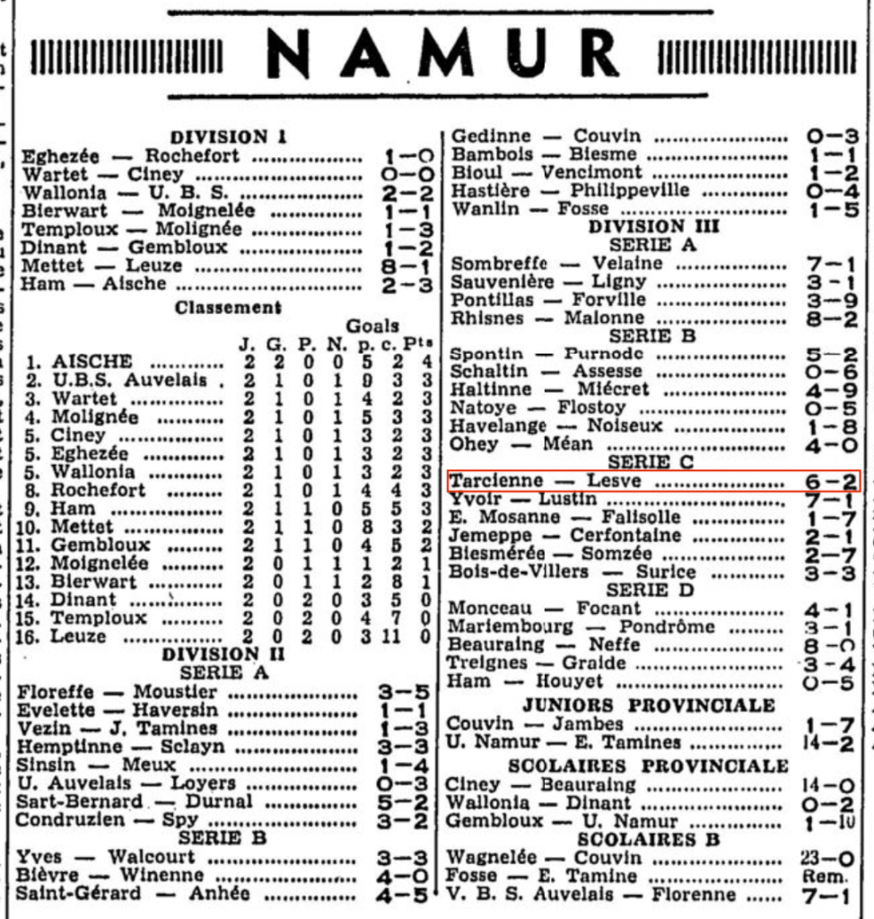 Notez qu’à au aucun moment, dans ce que j’ai pu lire, n’est mentionnée l’appellation « Espoir Tarciennois » qui apparaîtra, je pense, très peu de temps après cette première saison.